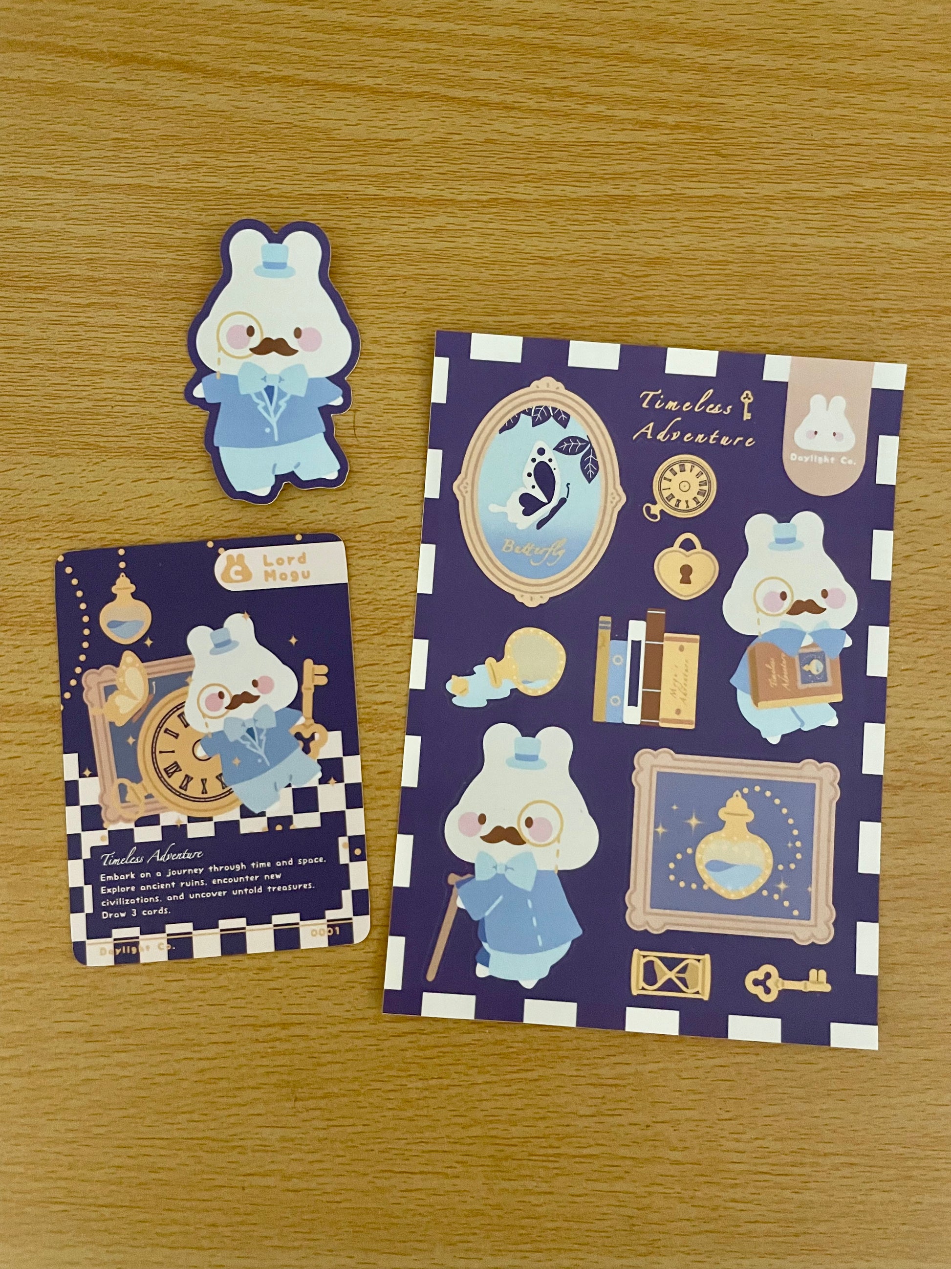 Product Type: 1 4x6 inch Sticker Sheet, 1 2.5 inch die cut sticker, 1 2.3x3.5 inch trading card, 1 25mm x 10m washi tape, 1 15mm x 10m washi tape, 1 10mm x 10m washi tape